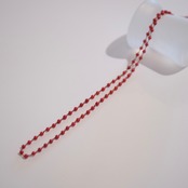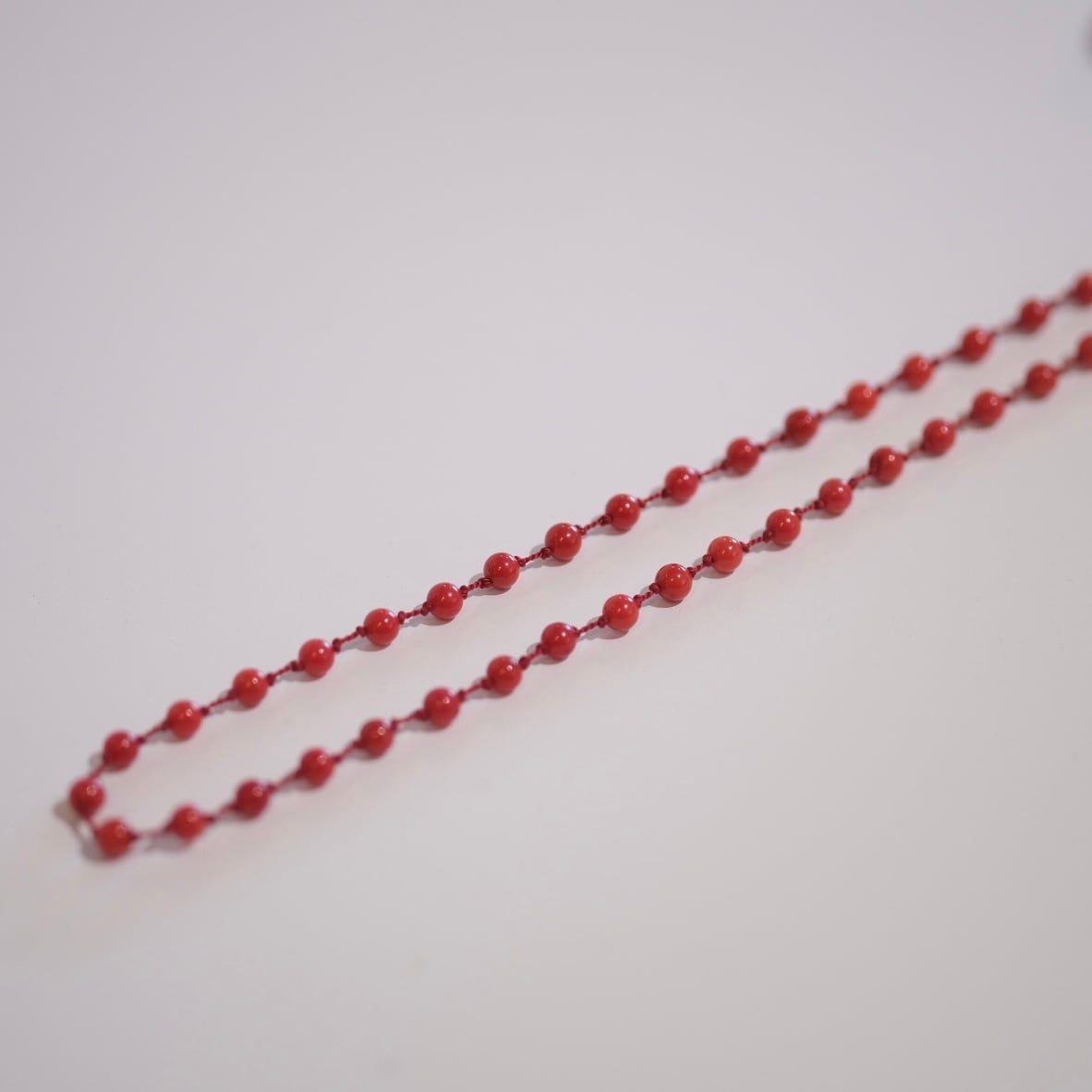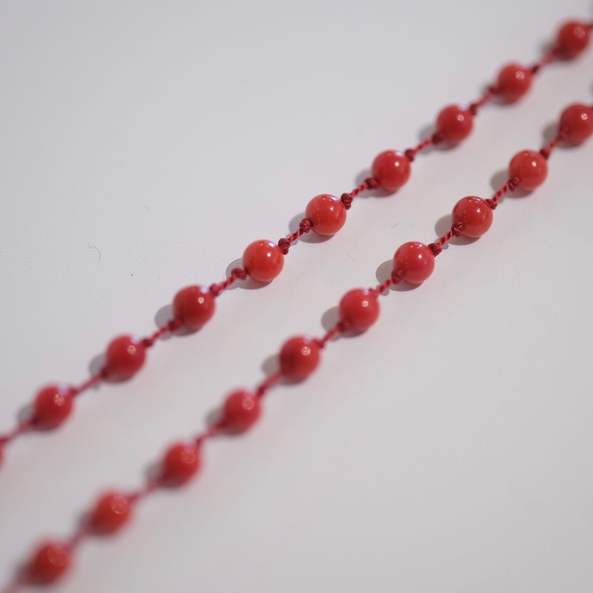 濃い赤の糸で繋げた落ち着いた色合いなので、