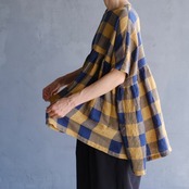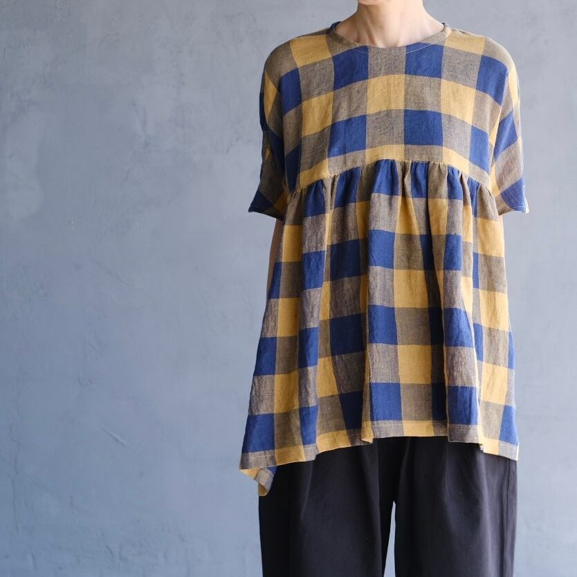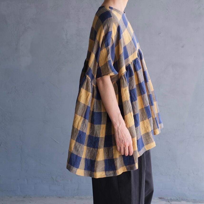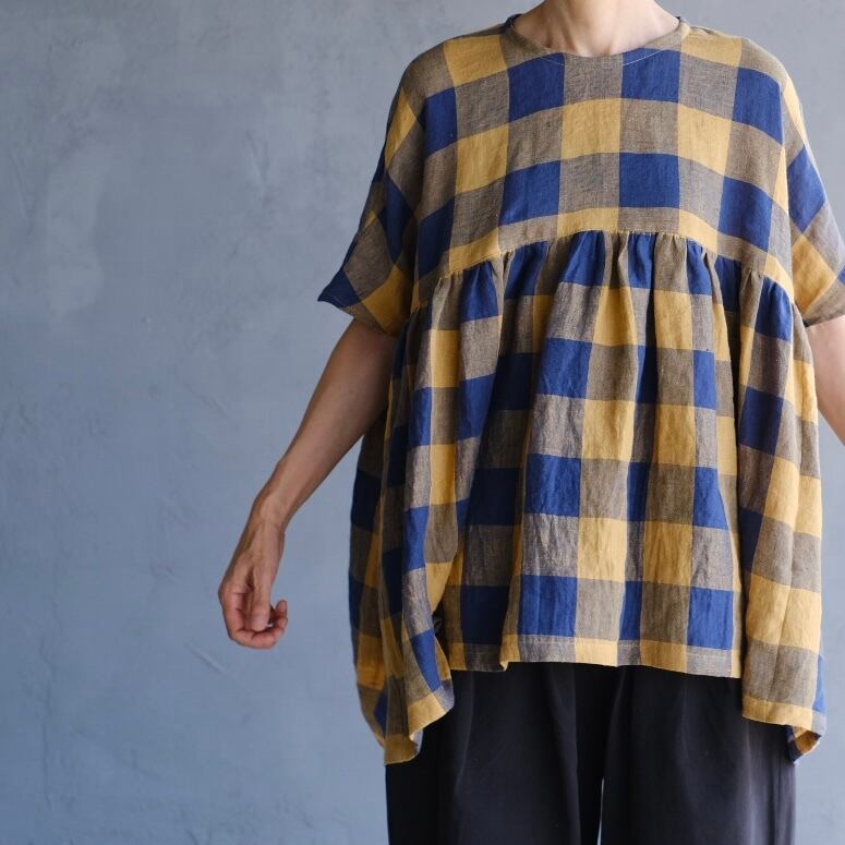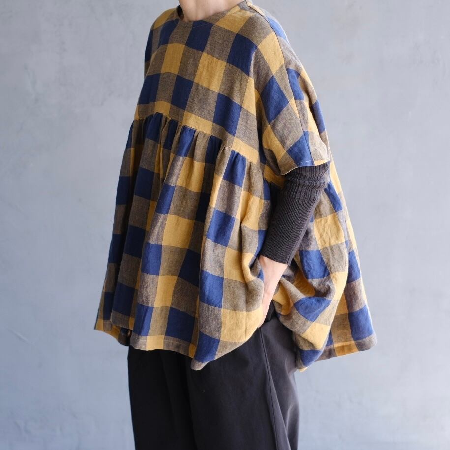 loosefit/リネンブロックチェックギャザープ ルオーバー