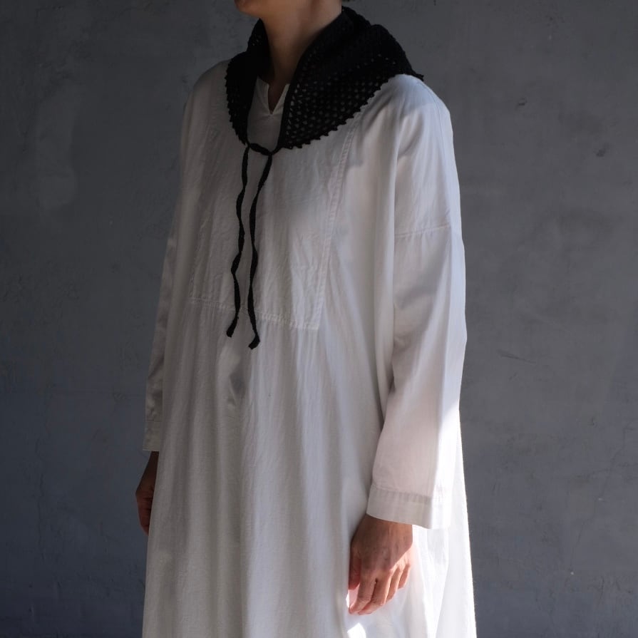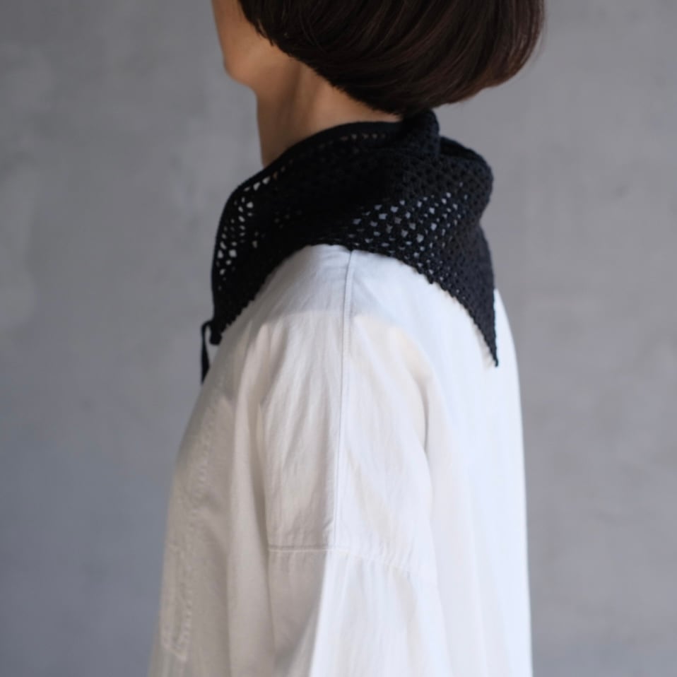リネンの糸で繊細に編まれたニットスカーフ。一点一点リトアニアで手編みされています。肩にかけて付衿のようにしたり、バンダナのように頭に巻いたり、コーディネートのワンポイントに。合わせやすいブラックとナチュラルの二色展開です。