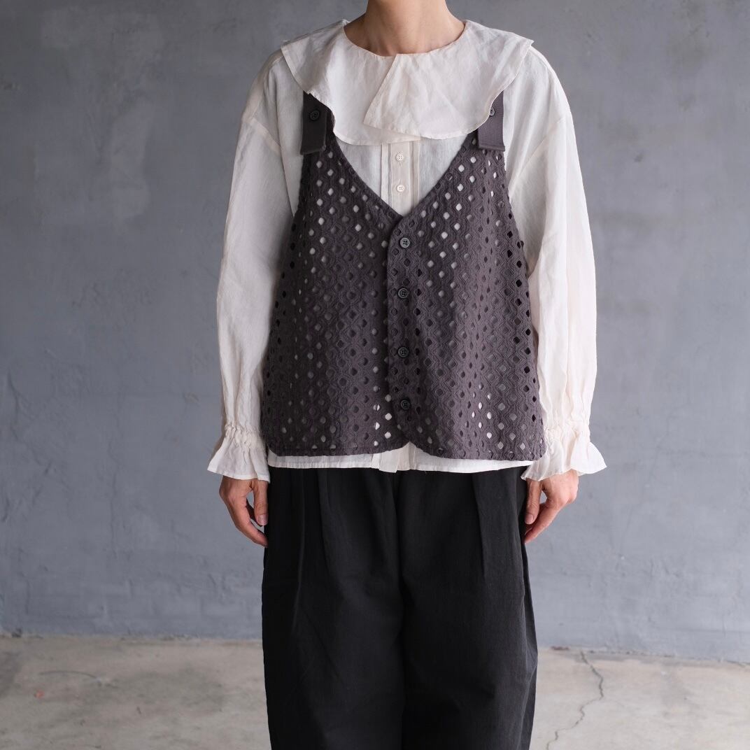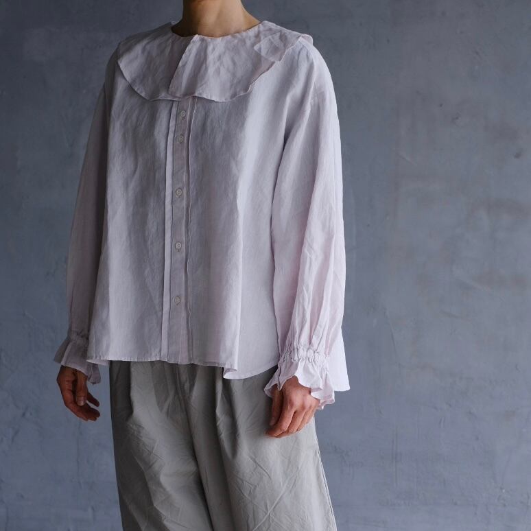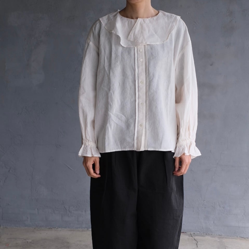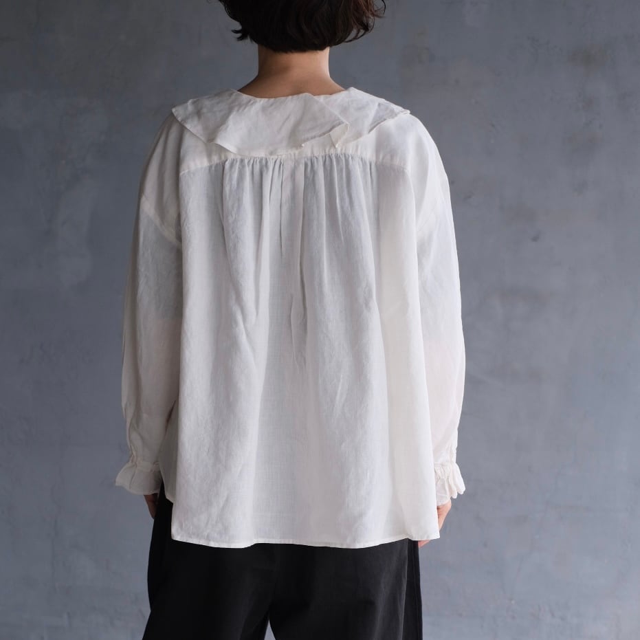 波打つように重なり合うラッフルフリルの襟元が印象的な一枚。