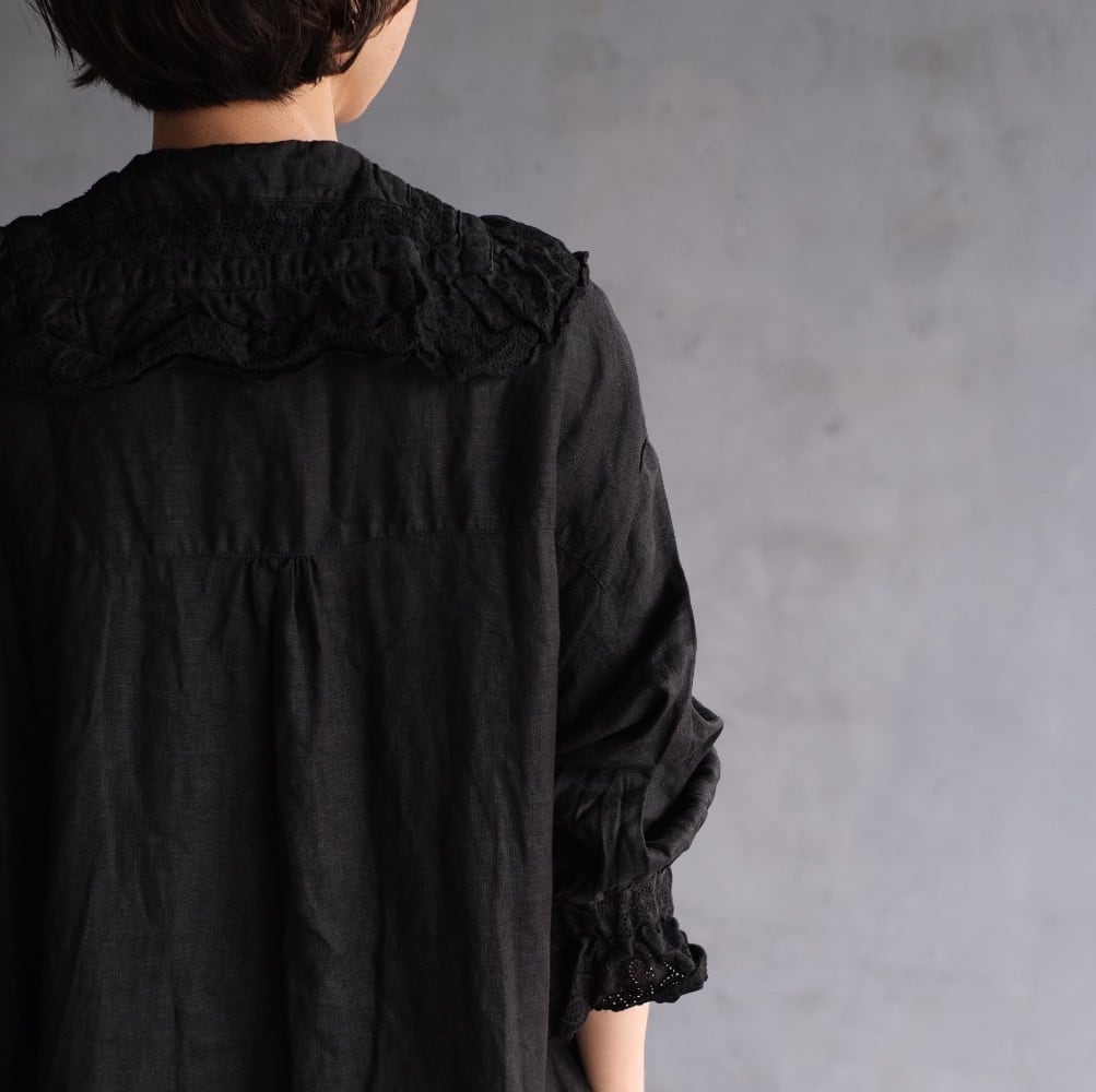 アンティークムード漂うレースフリルを襟元と袖口にあしらった一着。