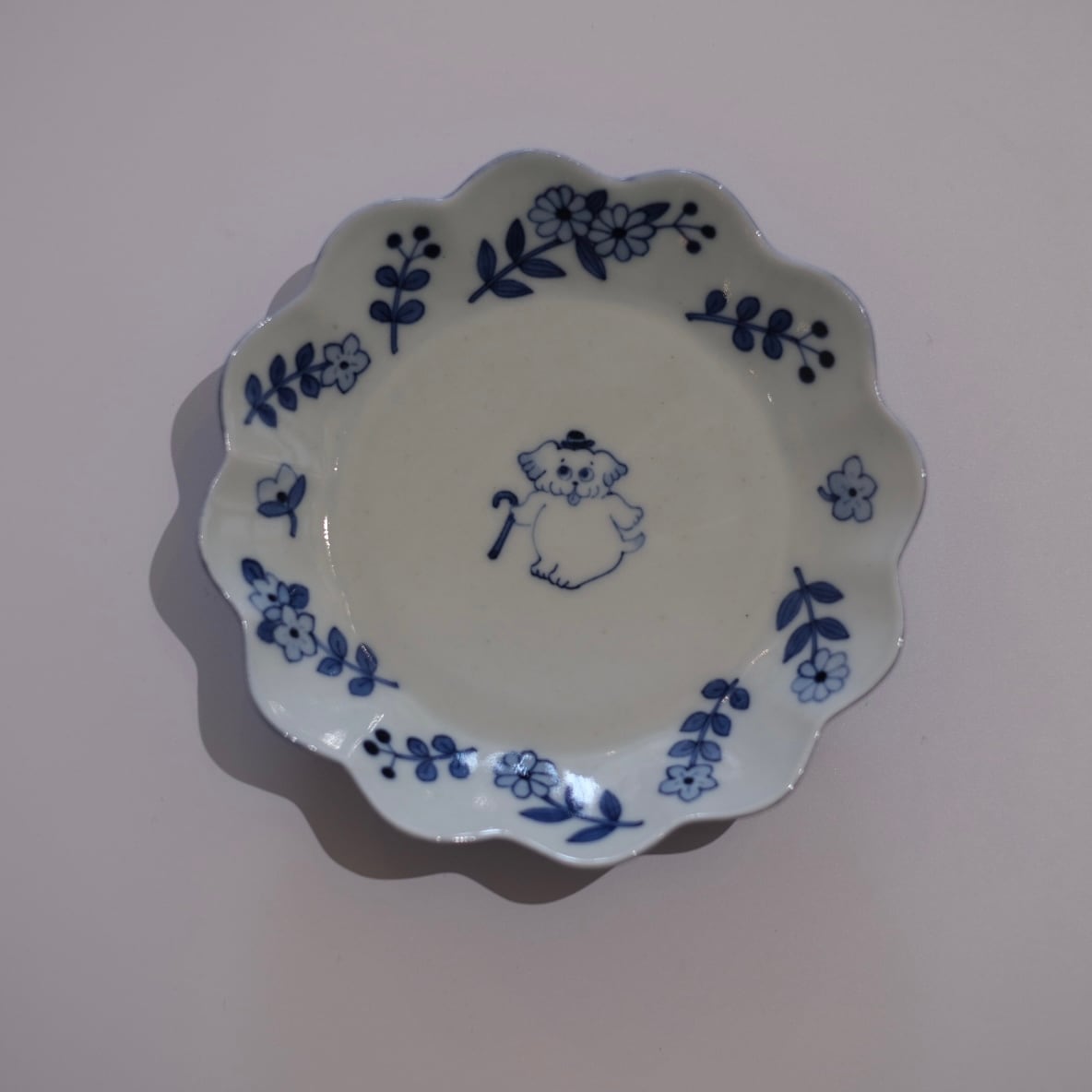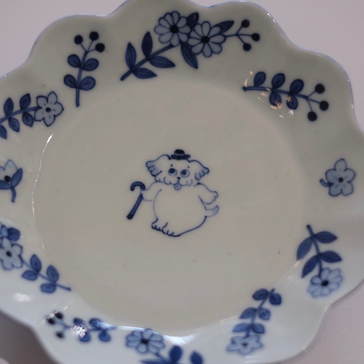 花模様と小さな動物たちが描かれた染付のうつわ。