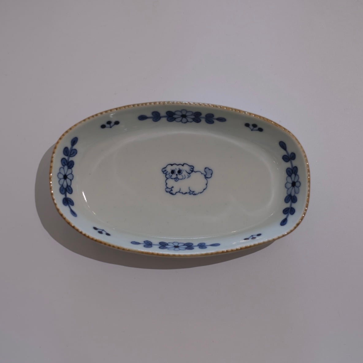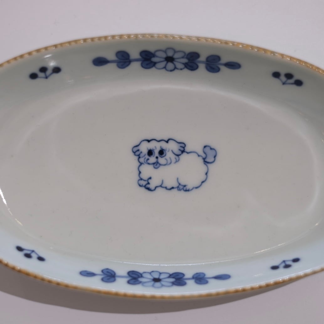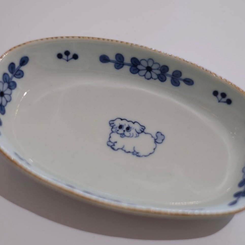 花模様と小さな動物たちが描かれた染付のうつわ。