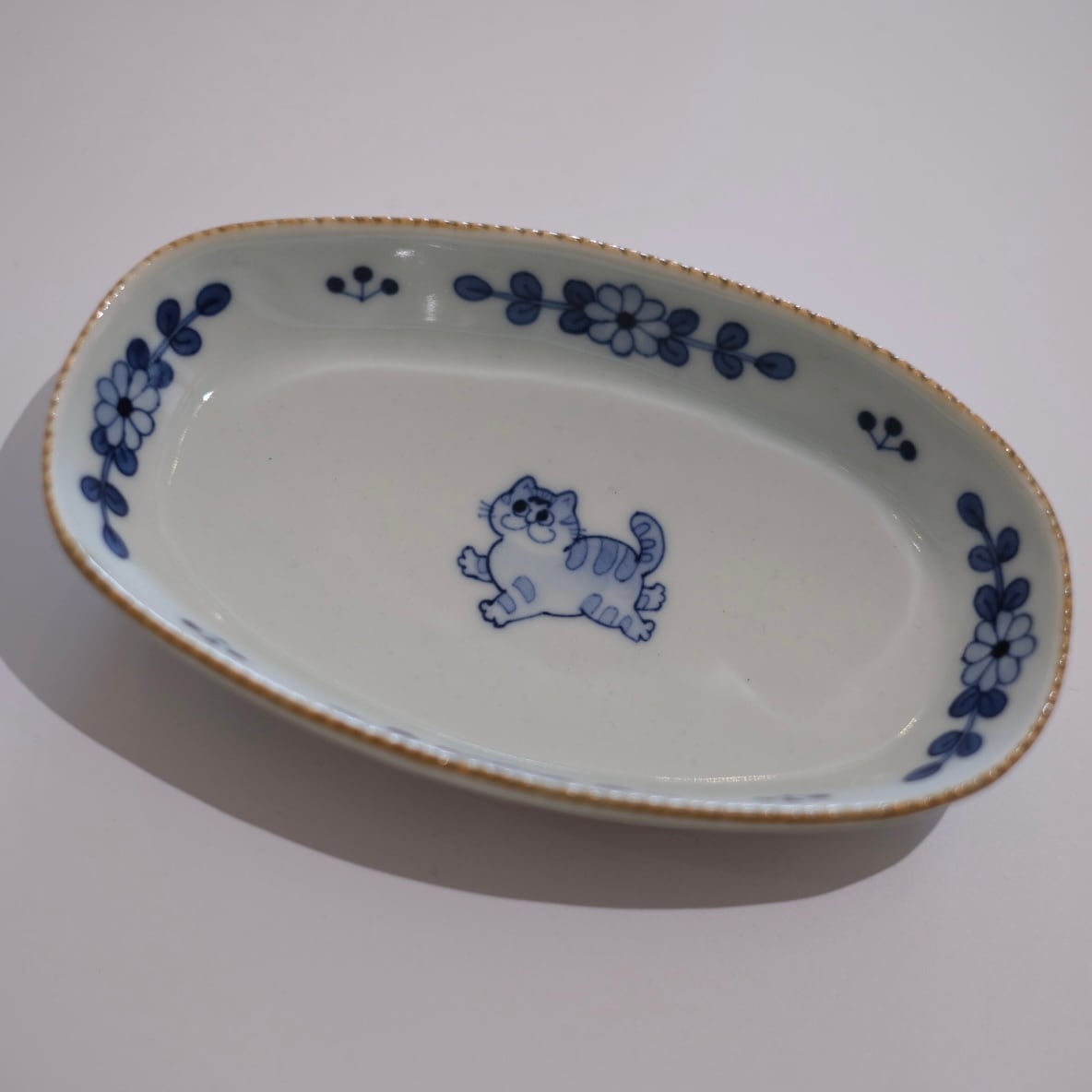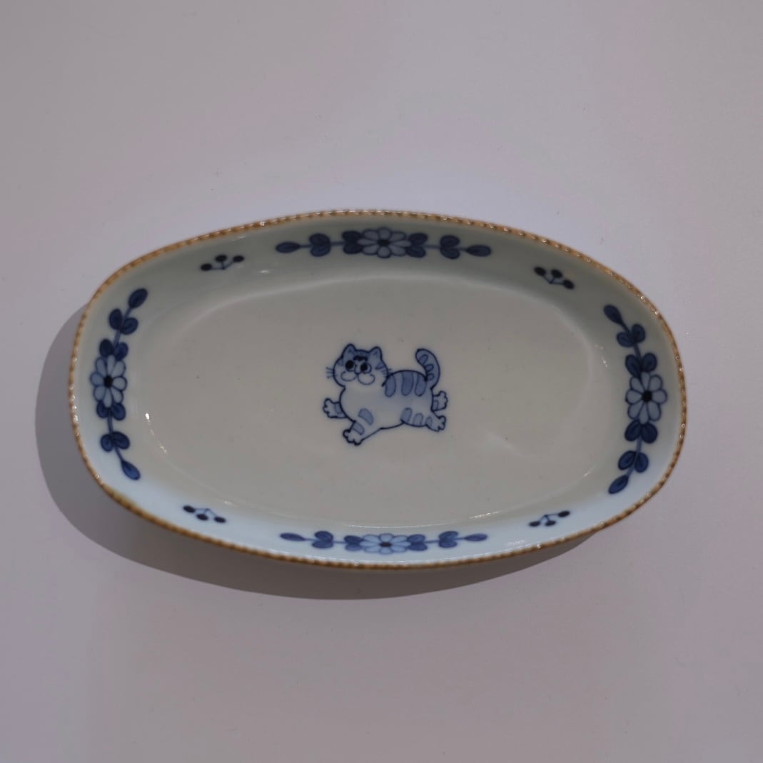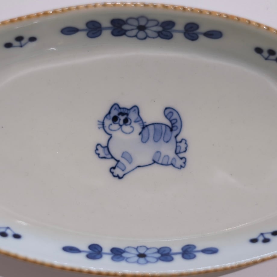 花模様と小さな動物たちが描かれた染付のうつわ。