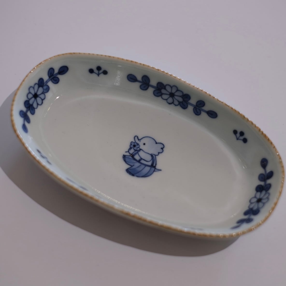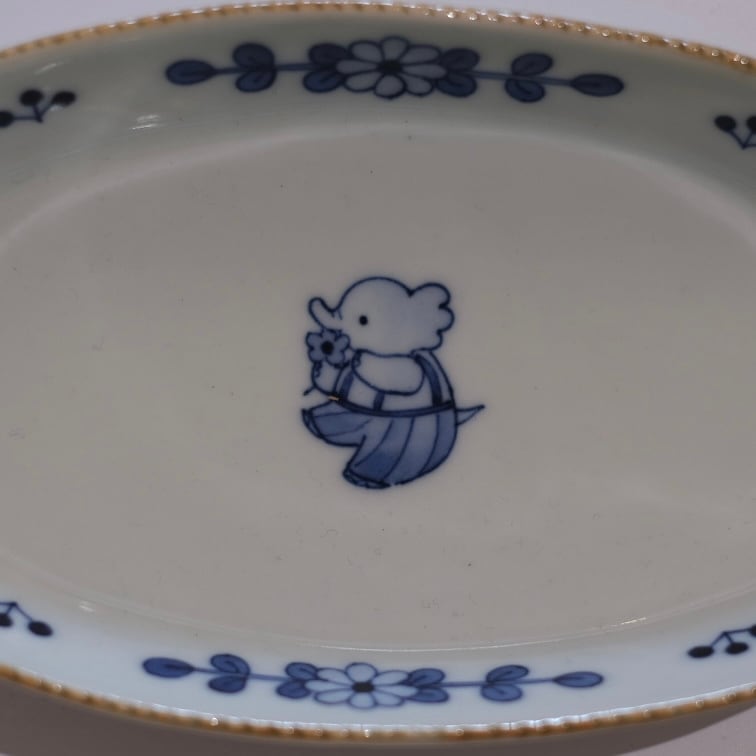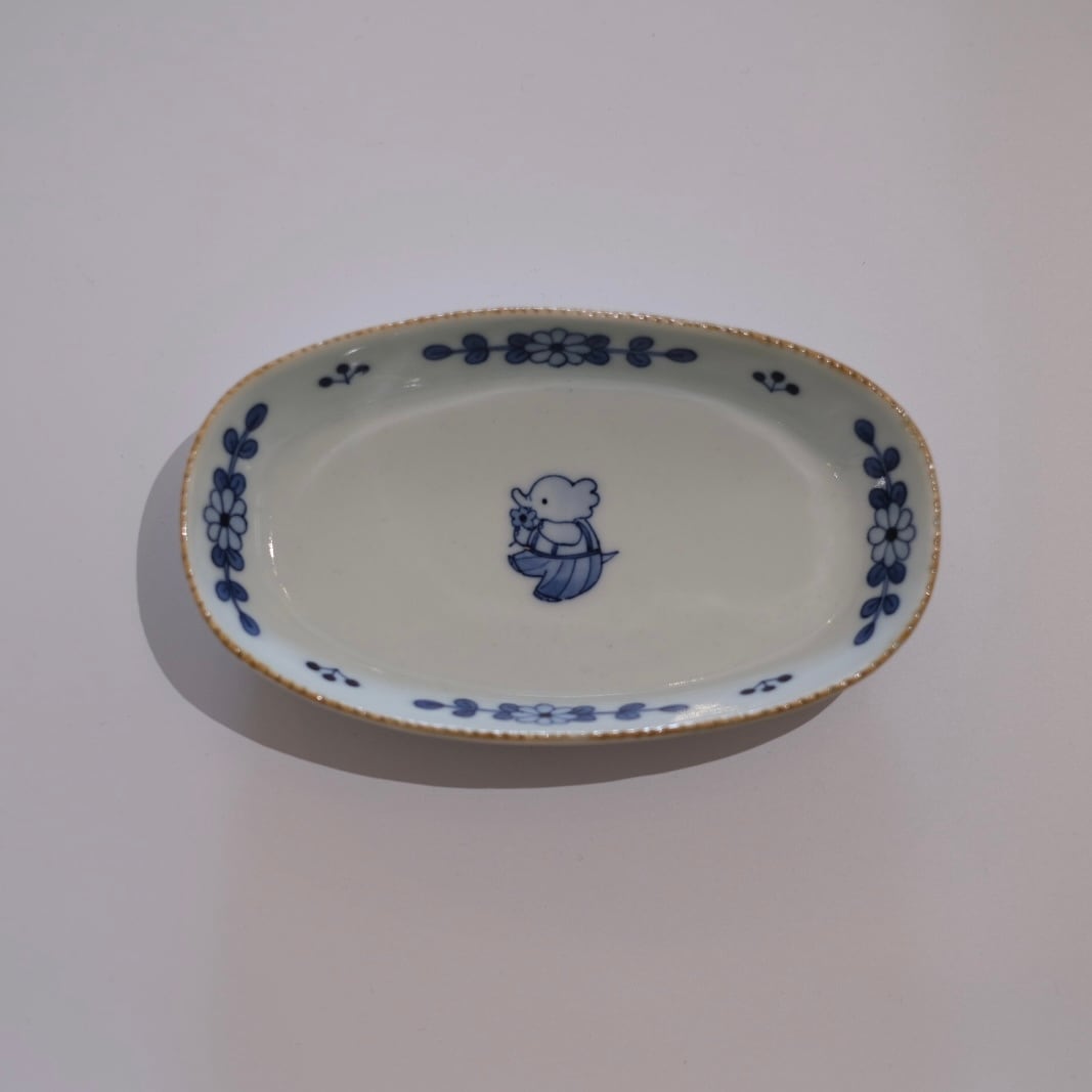 花模様と小さな動物たちが描かれた染付のうつわ。