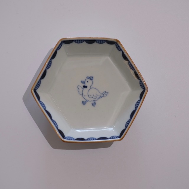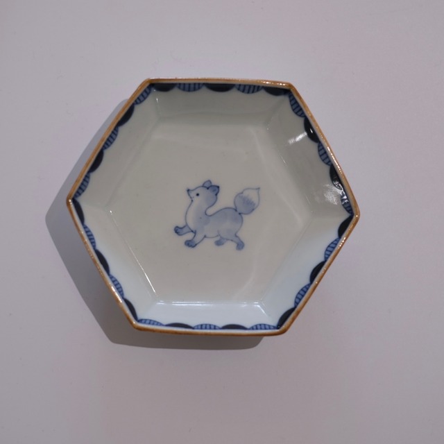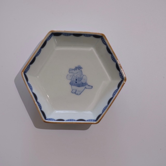 六角形のかたちが可愛らしい、小さな小鉢 中央には、わに、あひる、きつね、馬、くま、ひつじなど それぞれ違う動物たちが描かれています。 縁にはやさしい染付の波模様、 口縁の飴色のラインがアクセントに。 醤油皿やお漬物、ちょっとしたお菓子など 小さな一品にちょうどよいサイズ。 柄違いで揃えても楽しい器です。 食卓に遊び心を添えてくれる小鉢です。 ⸻ ◾️サイズ W10cm H2.8cm ⸻ ◾️取り扱い 電子レンジ ○ 食洗機 ○ ※直火・オーブン不可